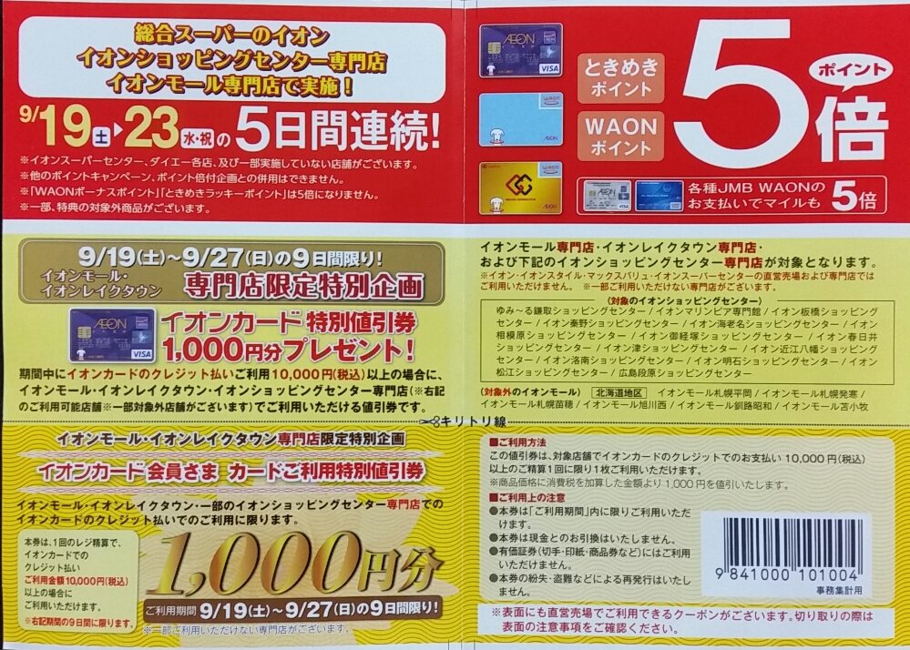 シルバーウィークの2015年9月19日(土)~9月23日(水・祝)の5日間は、イオンやイオンモールでポイント5倍になるキャンペーンも開催するので要チェックです!